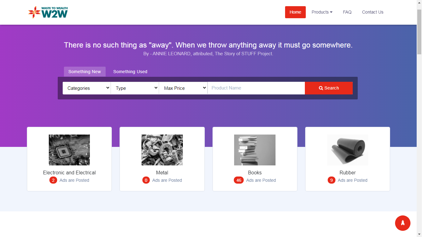Pioneer in reclassifying & modelling a marketplace to turn waste into wealth W2W was created to have a sustainable environment for a better future. Our platform offers simple steps to donate / give away, auction or bid for a range of items. An item that you may not need, might have a purpose somewhere to someone.